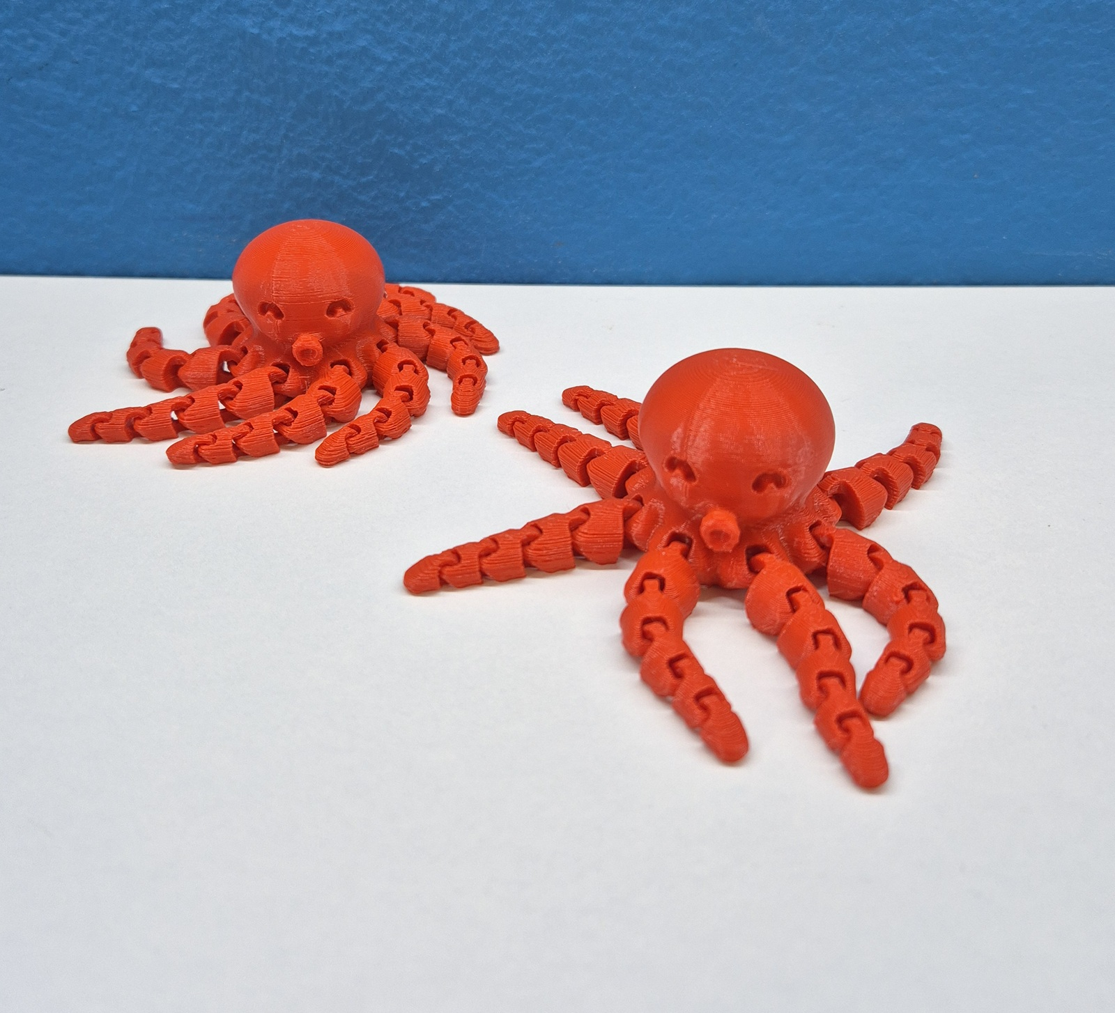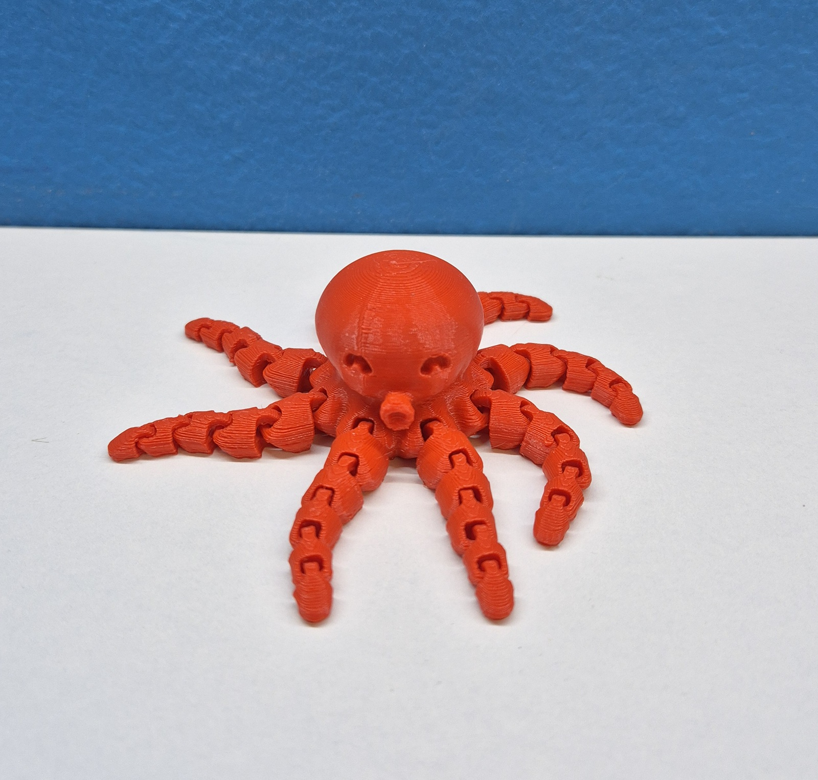 Jucărie imprimată 3D din PLA model flexibil, articulat, care imită mișcarea naturală a unei caracatițe adevărate. Funcționează ca o jucărie de birou satisfăcătoare sau ca un eliberator de stres. Printată în diverse culori precum roșu, albastru, verde, galben precum și în varianta bicolor albastru cu roz.