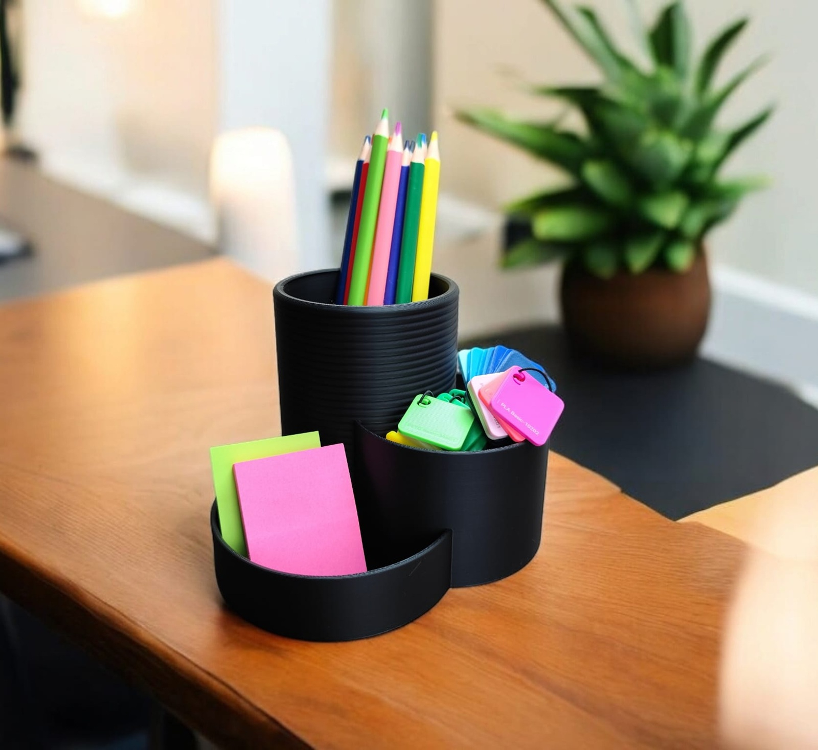 Acest organizator de birou multifuncțional, realizat prin printare 3D din PLA de calitate, este conceput pentru a aduce ordine și stil spațiului tău de lucru. Designul compact și modern permite organizarea eficientă a obiectelor esențiale de zi cu zi, fără a ocupa mult spațiu pe birou.