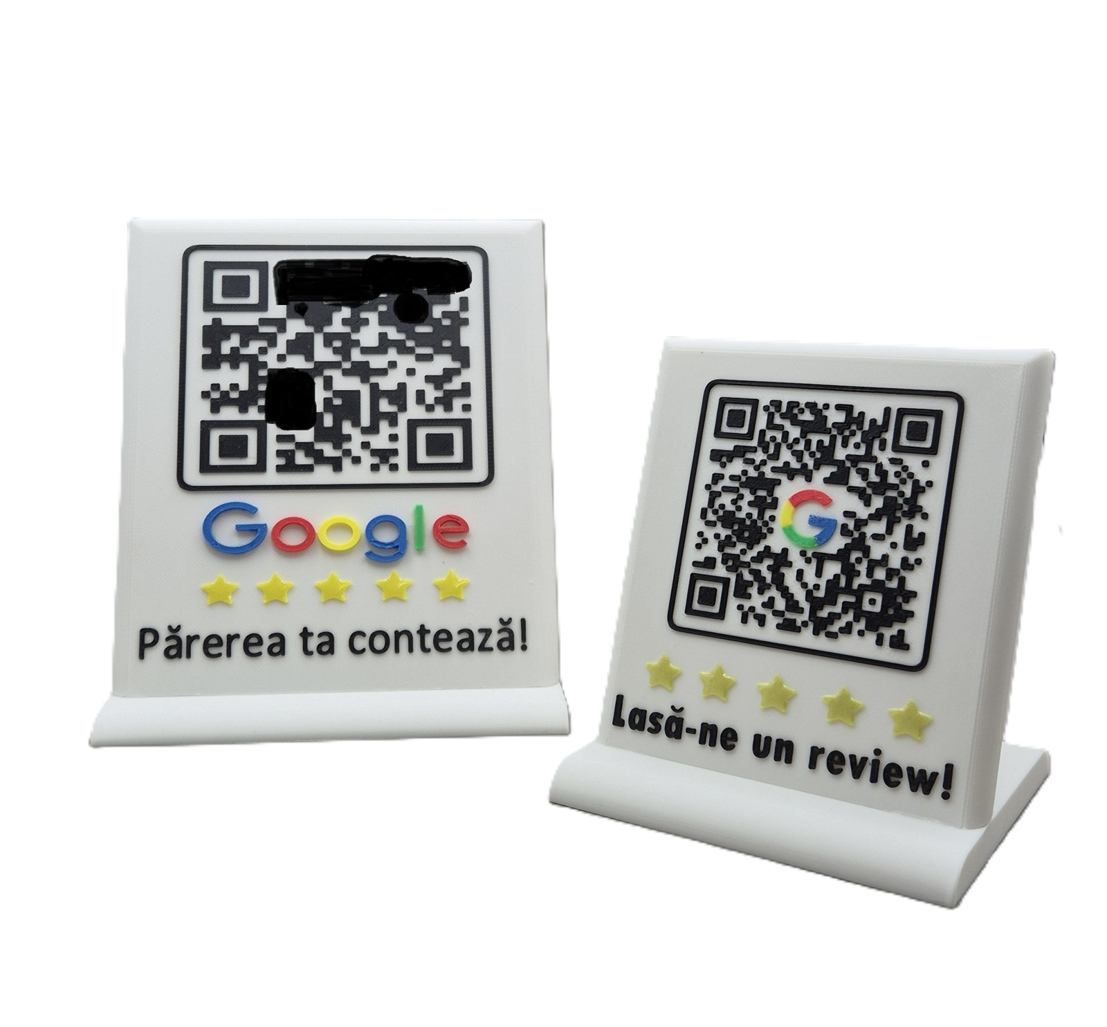 Codul QR este integrat în relief și este ușor de scanat cu orice smartphone, fiind perfect pentru redirecționare către Google Reviews, site-ul tău sau o pagină de feedback. Contrastul de culoare asigură lizibilitate excelentă, iar baza stabilă permite amplasarea pe tejghea, birou sau masă.