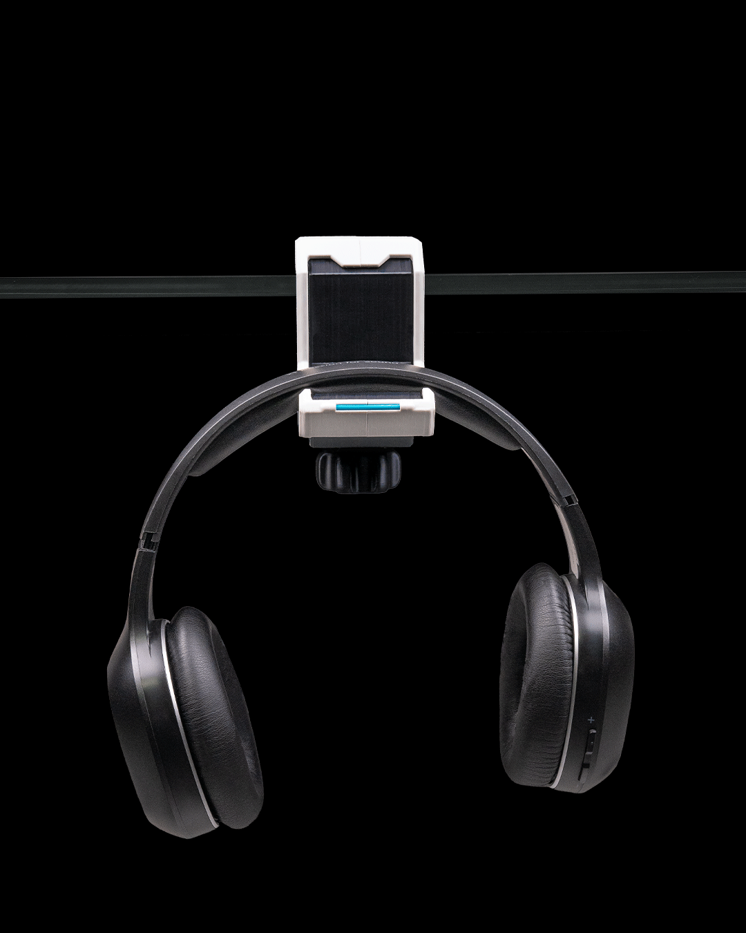 Suportul se fixează ferm pe marginea biroului cu ajutorul unui sistem de prindere reglabil, oferind stabilitate și o instalare rapidă fără găuri sau unelte complicate. Forma curbată susține banda căștilor în mod natural, prevenind deformarea sau deteriorarea acesteia.