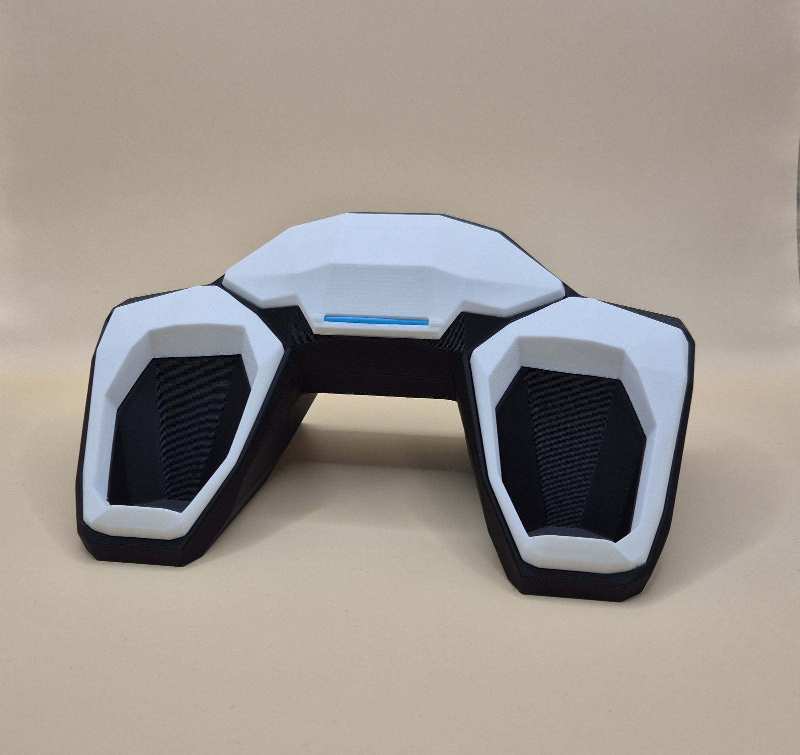 Suportul este realizat prin printare 3D din PLA de înaltă calitate, un material rezistent și durabil, cu un aspect modern. Forma sa geometrică oferă stabilitate excelentă și susține controllerul într-o poziție optimă, evidențiindu-l elegant pe birou sau pe raft.