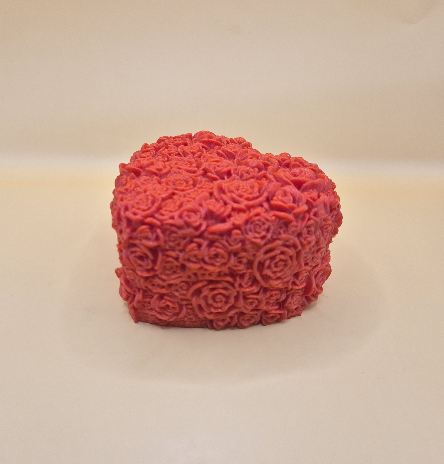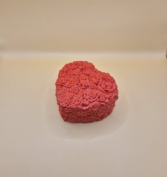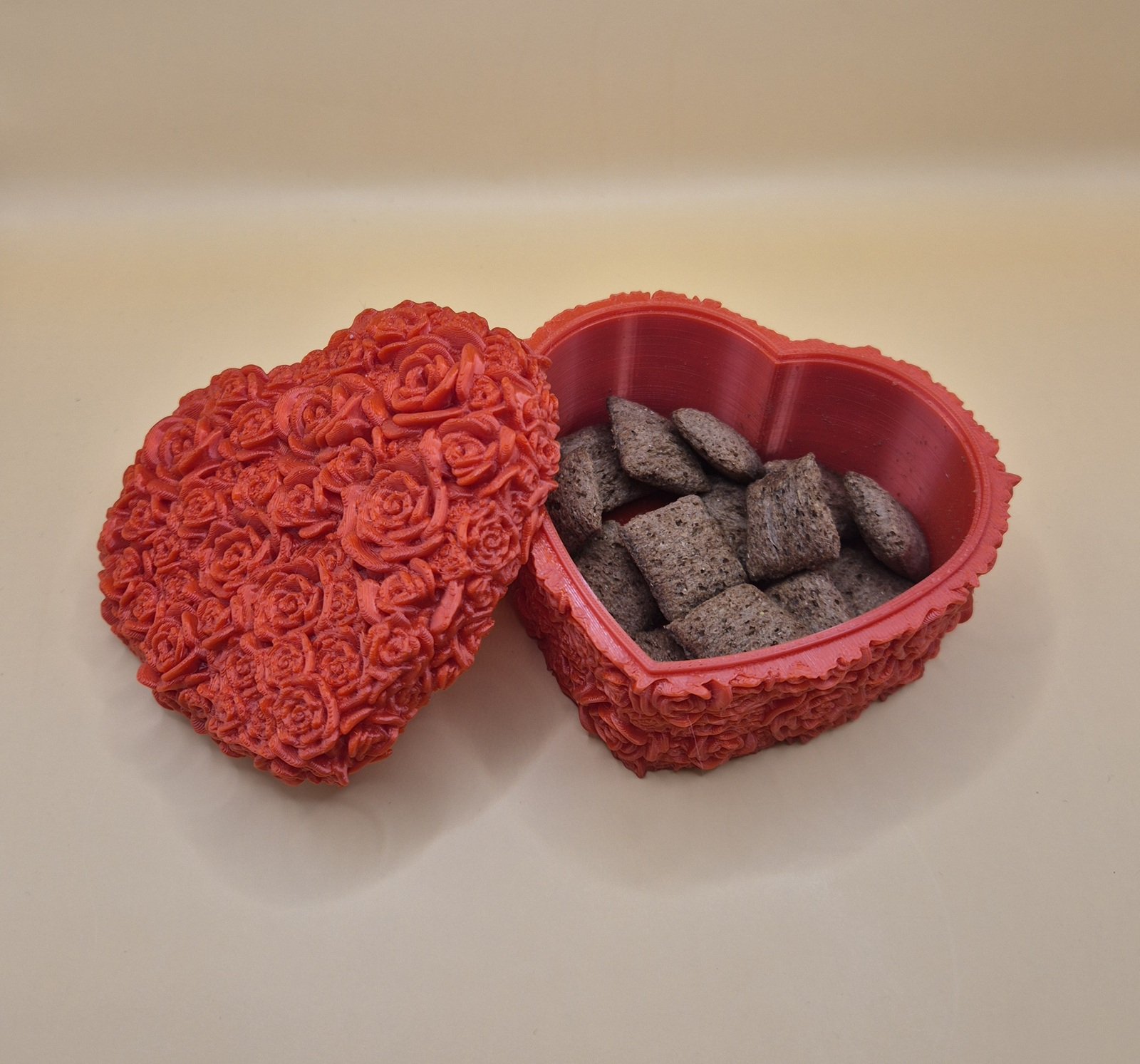 Această cutie elegantă în formă de inimă este realizată prin imprimare 3D din PLA, un material ecologic, biodegradabil și prietenos cu mediul. Designul exterior este deosebit, decorat cu un model detaliat de trandafiri în relief, care oferă un aspect romantic și rafinat.